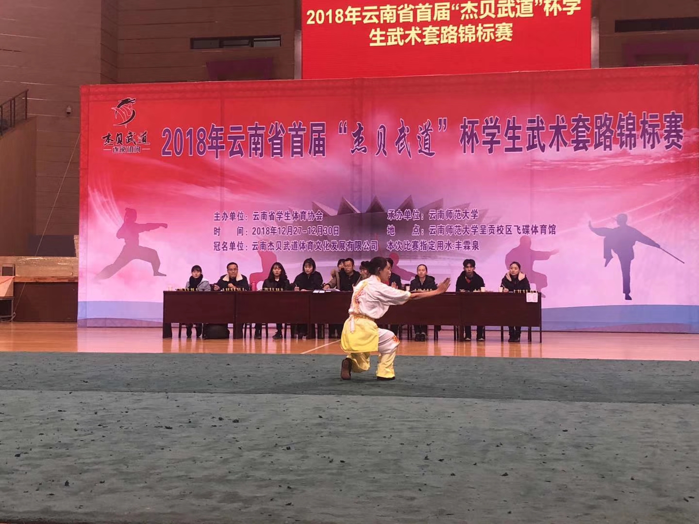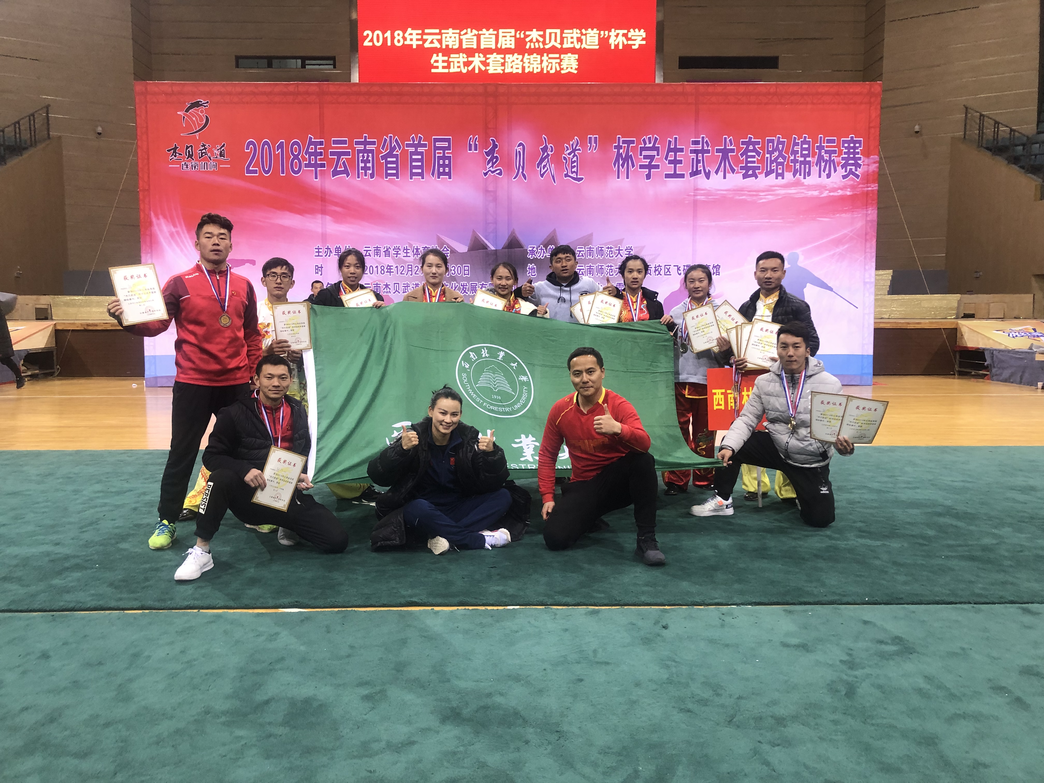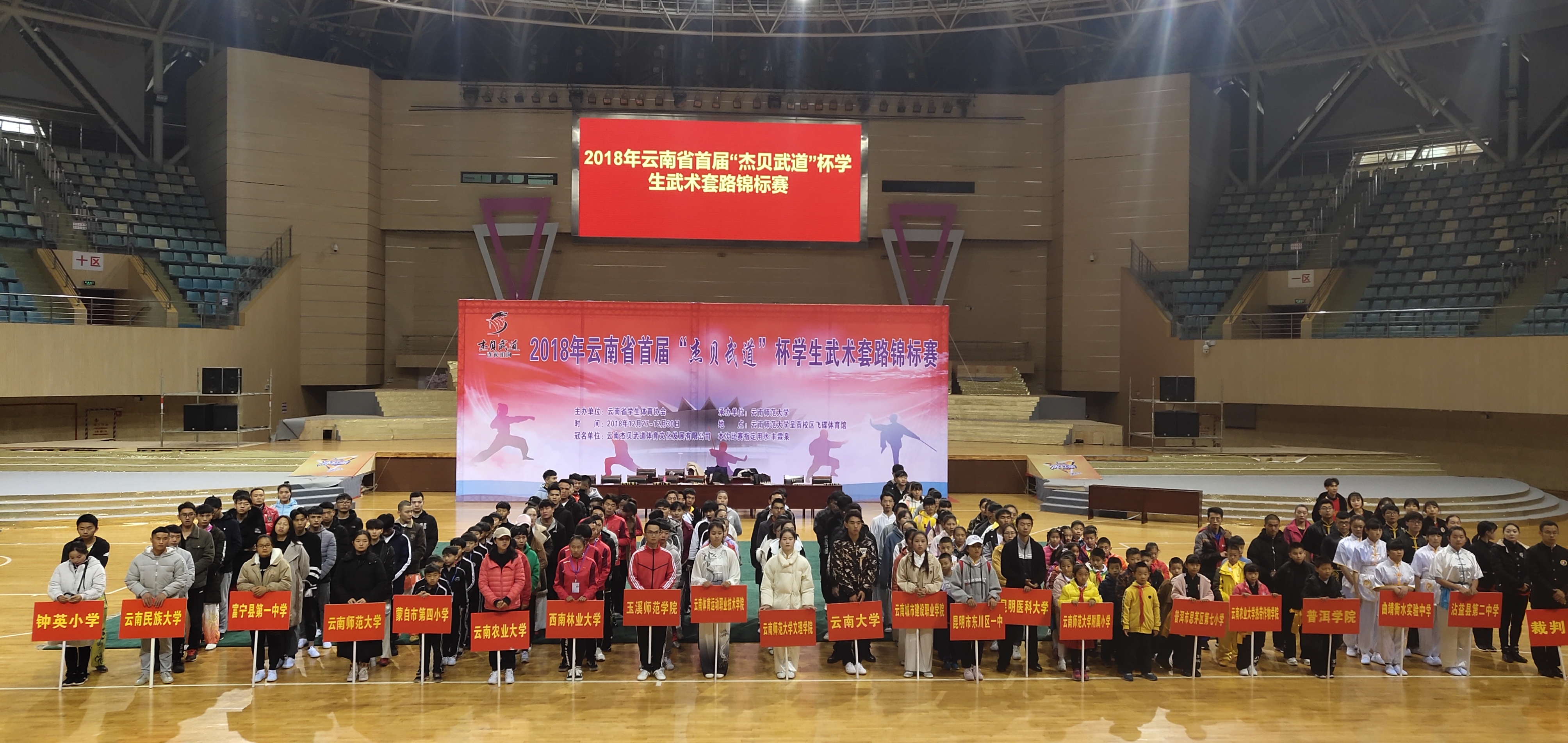 云南省第一届员工武术锦标赛,于2018年12月27日至30日在呈贡师大飞碟体育馆举行。首届举办的老员工武术比赛吸引了来自伟德中国官网、云南大学、云南师范大学、云南民族大学、云南农业大学、云南体育运动职业技术公司等省内各地13所高校参加,bevictor伟德官网由领队韦群杰老师,教练段静、关鹏、张洁莹三位老师组成,派出公司本科生7男6女共13名同学参加本次比赛28个单项1项集体项目的角逐。